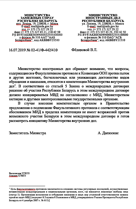 16 июля 2019 года Министерство иностранных дел прислало правозащитникам электронный ответ. В ответе заявляется, что инициатором подписания Факультативного протокола должно быть МВД по согласованию с МИД и Минюстом. Также МИД подчеркнул, что не имеет возражений в случае внесения предложения о подписании Факультативного протокола к Конвенции против пыток.