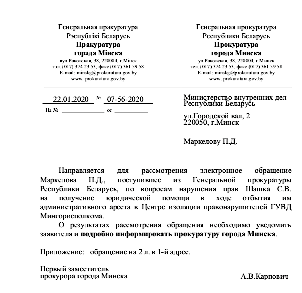 Казалось бы: жалобы приняты, права активистов должны быть восстановлены. Так гласит статья 4 Закона «О прокуратуре Республики Беларусь». Но в работе прокуратуры всё с самого начала шло не так. Н.Н. Геращенко вместо ответа по существу переслал жалобу в ГУВД. Генеральная прокуратура переслала жалобу в прокуратуру города Минска, а та – снова в ГУВД. Время идет, адвокатов пустили, Петр со Стасом уже успели выйти на свободу, но ответов от прокуратуры до сих пор нет.