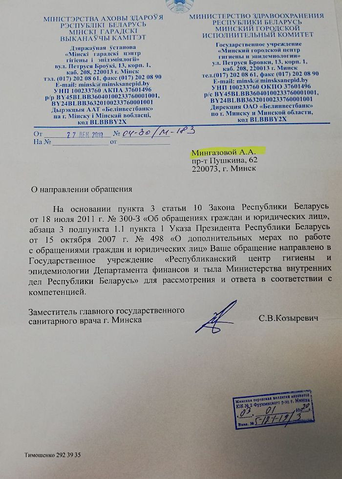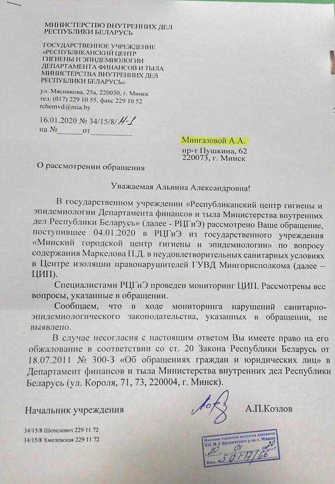 Когда Петр сообщил о вшах у сокамерника, адвокат подала жалобу в ГУ «Минский городской центр гигиены и эпидемиологии». Тогда появилась надежда, что на ситуацию в ЦИП обратит внимание хотя бы один орган, не связанный с МВД. Но последний ответ погубил эту надежду: жалобу перенаправили в «Республиканский центр гигиены и эпидемиологии департамента финансов и тыла МВД».